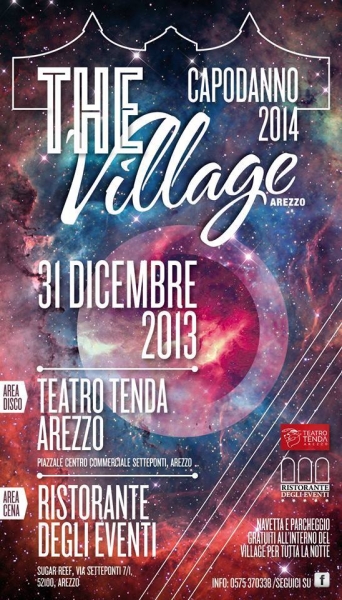The Village presenta due aree collegate per tutta la sera tra loro da navette gratuite, formando un polo del divertimento per tutti i gusti e le età , pensato appositamente per salutare il vecchio anno e quello che verrà , senza bisogno di grandi spostamenti o di mettersi alla guida dopo cena. Si parte alle 21 presso i locali dell'ex Sugar Reef Musicology che ospiterà il Ristorante degli Eventi, il cenone di gala con spettacolo e a seguire happy music live & dj disco, mentre dalle 22 diventa protagonista il Teatro Tenda, la nuova struttura multifunzionale del Comune di Arezzo, accanto al centro commerciale Setteponti, con un party esplosivo tra musica, allestimenti e tanto divertimento per il pubblico più giovane. Ma non è finita, perchè dalle 2.30 ecco Fuori orario, l'after party all'Officina7 per gli infaticabili della notte, che si protrarrà fino al mattino con assoluto protagonista Luca Agnelli, il dj toscano, ma anche producer e remixer in continua evoluzione musicale, sempre alla ricerca di nuovi stimoli ed obiettivi, sperimentando sempre nuovi percorsi e reinventando nuovi linguaggi musicali e poi i djs di Arezzo e provincia come Elia Perrone, Niro Perrone, Speaking Minds, Riccardo Laurenti e la voce di Monero Berneschi.