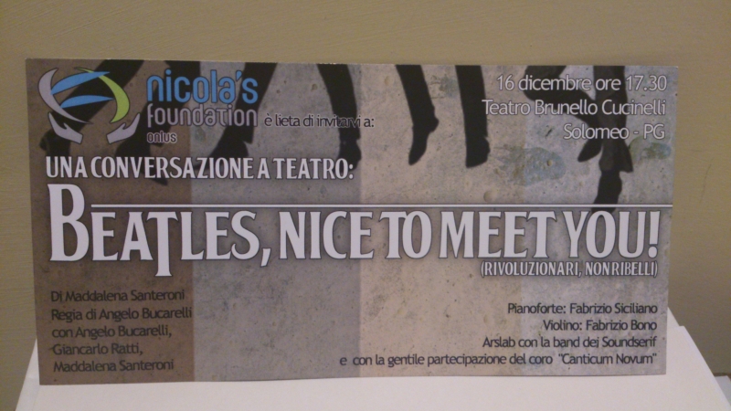 "Beatles, nice  to meet you" sottotitolo "rivoluzionari non ribelli" è il titolo del bello spettacolo messo in scena al Teatro Cucinelli di Solomeo ( Perugia) da Maddalena Santeroni e Angelo Bucarelli nell'ambito della serata dedicata alla Nicola's Foundation del professor Giuliano Cerulli. Si è trattato di un viaggio attraverso la vita e la storia del Beatles, il gruppo che più di ogni altro ha caratterizzato la musica inglese degli anni Sessanta e Settanta. Fabrizio Siciliano al pianoforte e Fabrizio Bono al violino hanno proposto: EEleanor Rigby" "Norwegian wood" e "Long and winding road" mentre la band dei Sound Serif "Love me do", "Image", "Hey Jude", "Help" e molti altri successi. al termine, davanti ad un teatro gremito e alla presenza del padrone di casa, l'imprenditore del cachemire Brunello Cucinelli, il Canticum Novum si è esibito in "Yesterday" e "So this is Christmas war is over" brano che ha coinvolto l'intero pubblico. La Fondazione, che havoluto l'evento, insieme ad altri prestigiosi sponsor tra cui la "Perugina" è nata nel 2006 per volontà del professor Giuliano Cerulli, autentico luminare dell'ortopedia, con lo scopo di fare solidarietà sociale e scientifica, di promuovere e coordinare iniziative nel settore sanitario per la ricerca e la formazione, la cura e l'informazione secondo principi scientifici ed etici, coinvolgendo profesionalità nazionali ed internazionali. Il "teaching and research center" della Fondazione ha sede in via Einstein ad Arezzo.  "Siamo molto orgogliosi - ha detto un commosso Cerulli - che i giovani oggi possano fare ricerca tornando alla sperimentazione  per una chirurgia più sicura per i pazienti senza dover per forza andare all'estero". Felice per l'evento si è mostrato anche Brunello Cucinelli, autentico mecenate e ispiratore di grandi iniziative a livello locale.
