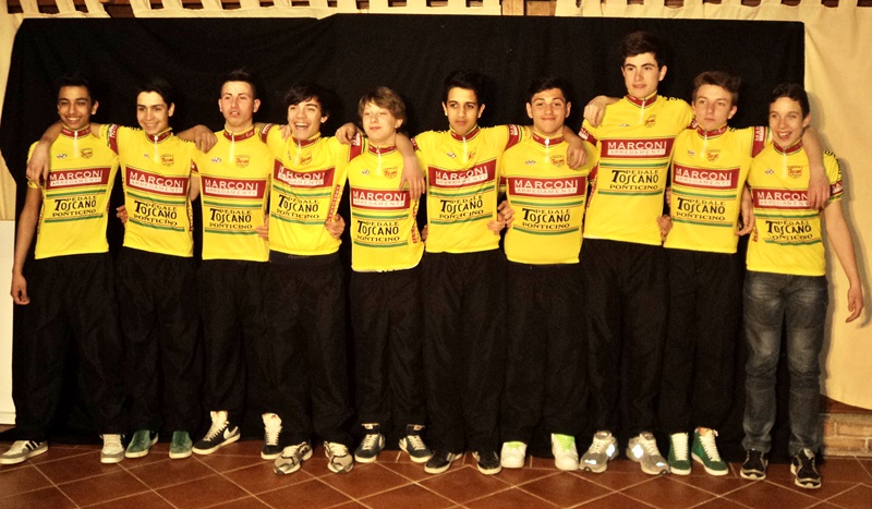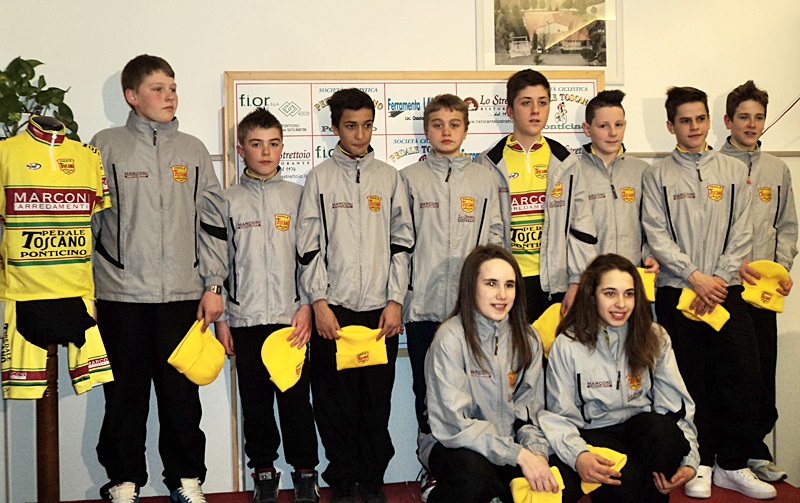 "48 anni di vita e 48 ragazzi tesserati. Se qualcuno crede alla cabala non può che essere una stagione ricca di successi". A parlare è Enzo Ghinazzi in arte Pupo, una gradita sorpresa alla presentazione della Sc Pedale Toscano - Ponticino, la gloriosa società del Valdarno aretino che si presenta ai nastri ai partenza della nuova stagione con molte novità e sempre grandissimo entusiasmo, un entusiasmo che - sia detto senza retorica - traspare dai volti dei piccoli atleti, dei loro genitori, del nutrito gruppo di tifosi: tutti uniti nel nome del Pedale (con la P maiuscola) e tutti pronti a portare per le strade della Toscana una passione verace per i corridori di giallo vestiti. La novità più evidente è la maglia, disegnata appositamente per creare un mix fra le storiche divise ciclistiche e le esigenze del nuovo main sponsor, quella Marconi Arredamenti che ad Arezzo sta facendo tanto per il ciclismo. Il Pedale Toscano riparte nel 2013 dalle vittorie del 2012, fra cui spicca quel campionato regionale Donne esordienti con Sofia Gori, che quest'anno è passata Allieva regalando così un altro record al team diretto da Giancarlo Gavilli: è la prima volta che viene tesserata una ragazza in questa categoria, segno che l'esperienza nel settore femminile sta dando buoni frutti. Prima di accendere i riflettori sulle squadre, Giancarlo Gavilli ha voluto ringraziare tutti "dai dirigenti ai genitori, siamo una grande famiglia, remiamo tutti nella stessa direzione.