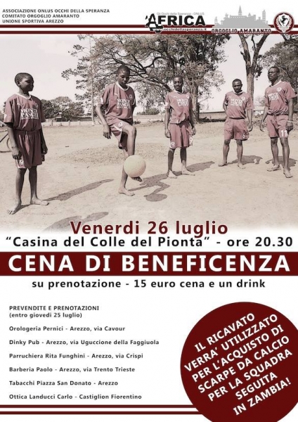 Orgoglio Amaranto e “gli occhi della speranza” hanno quindi fissato per venerdì 26 luglio una cena di beneficenza presso la Casina del Colle del Pionta, ad Arezzo, il cui obiettivo sarà quello di raccogliere fondi per l’ acquisto di scarpe da calcio da spedire ai ragazzi nello Zambia. Per partecipare è necessario prenotarsi entro giovedì 25 luglio presso i seguenti esercizi commerciali: