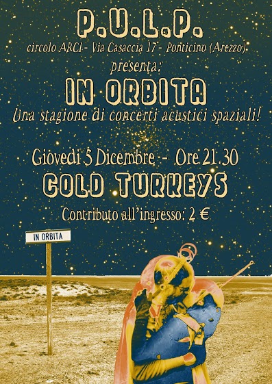 Giovedì 5 Dicembre, alle 21.30, al circolo P.U.L.P. si svolgerà il quinto appuntamento della rassegna "In Orbita", le sessioni acustiche delle migliori band aretine. Per l'occasione il palco di via della Casaccia 17 a Ponticino ospiterà il live dei Cold Turkeys, quattro ragazzi (Matteo Bolgi, Fabio Cristofoletti, Francesco Torzoni e Andrea Salvadori) che nonostante la giovane età non hanno avuto bisogno di molto tempo per farsi notare per la ricercatezza degli arrangiamenti e per il frizzante genere musicale che unisce la migliore musica indipendente degli ultimi 20 anni, la ballabilità del funk e la melodia delle più blasonate band britanniche. Musica per ballare, saltare e molleggiare. Questa volta però i quattro aretini saranno messi alla prova per riuscire a trasmettere il loro brio nella chiave inusuale del concerto acustico. Non una missione impossibile per una delle più energiche band aretine che promette di stupire anche in versione unplugged. Giovedì 19 Dicembre il palco di "In Orbita" verrà calcato dai Sincope And The Squirrel Gang per l'ultimo live dell'anno prima della pausa natalizia.