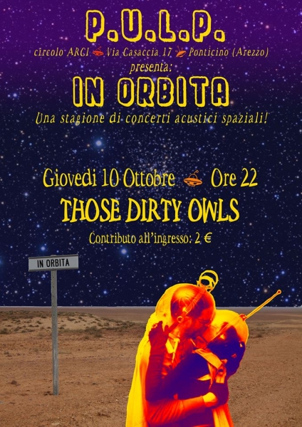 Il circolo P.U.L.P. di Ponticino presenta "In Orbita", la nuova stagione di concerti anticipata dal live di Alessandro Raina, che il 26 Aprile aveva presentato in esclusiva in chiave unplugged i pezzi degli Amor Fou. La nuova rassegna sarà improntata sui live acustici delle migliori band locali in un'atmosfera unica che a suo modo cercherà di trascinare lo spettatore in un live nello spazio. Per due giovedì al mese, il circolo P.U.L.P. di Ponticino si trasformerà in un incrocio tra un blues club e un lounge bar dove luci soffuse e nuvole di cuscini la faranno da padrona e dove le band saranno chiamate a snaturare il proprio sound per un live fatto di chitarre acustiche e suoni intimi. Il primo appuntamento sarà giovedì 10 Ottobre, quando sul palco di "In Orbita" saliranno i Those Dirty Owls, band formata da Marco Roggi (chitarra e voce) , Luca Magi (batteria), Francesco Cipriani (basso) e Stefano Del Pianta (piano e sintetizzatore), che si cimenteranno in una rielaborazione inedita delle canzoni tratte dal loro omonimo Ep del 2011 e dei nuovi brani che la band presenterà in autunno in versione elettrica. Inoltre ogni band partecipante sarà chiamata alla rivisitazione di una cover a scelta di qualsiasi genere, in modo da rendere ancora più unico l'evento. L'ingresso ad ogni serata di "In Orbita" sarà ad un prezzo contenuto e nazional-popolare. L'appuntamento con la seconda serata è già fissato per il 24 Ottobre, quando sul palco del P.U.L.P. in via della Casaccia 17 a Ponticino saliranno i Freaks.